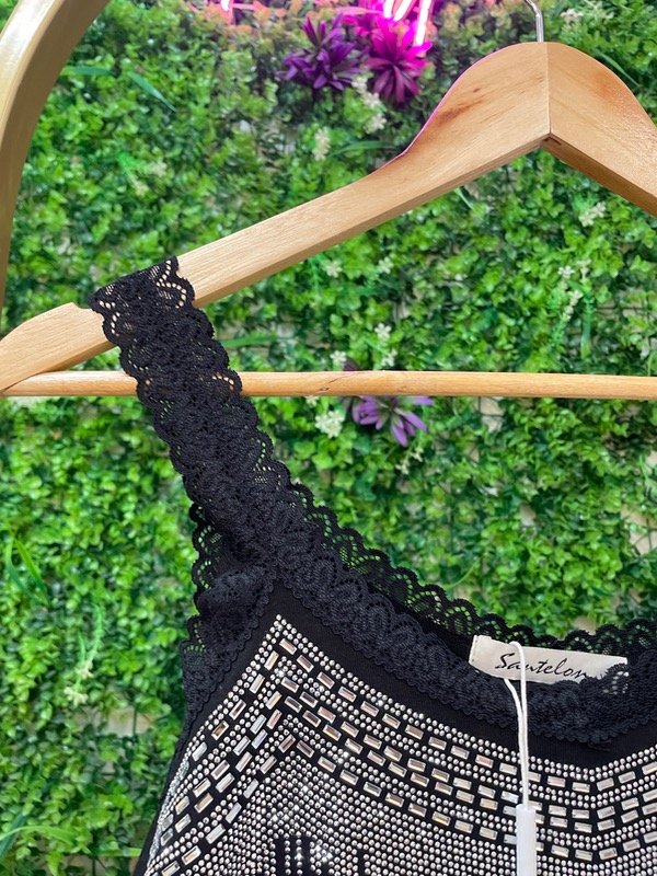 Un diseño súper delicado y femenino. Con tiras de encaje que le dan un toque romántico y strass en el frente para ese brillo justo que levanta cualquier look.