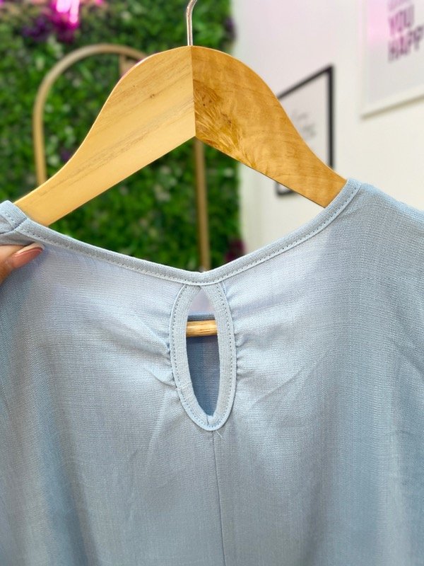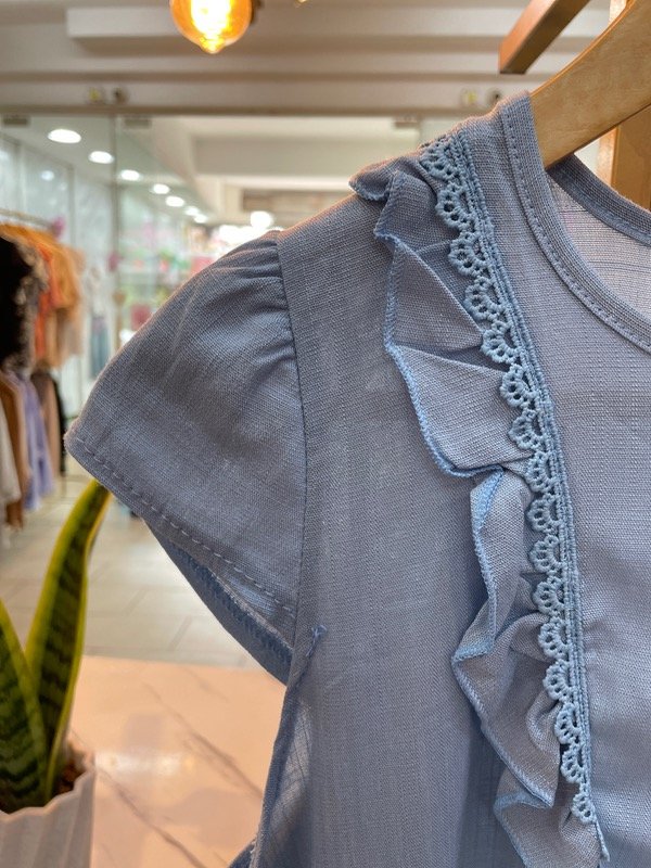 Esta blusa de lino celeste elastizado es pura delicadeza y frescura. Su diseño encantador incluye manguitas cortas con voladitos y un detalle de puntilla en el frente, que le aporta un toque romántico y artesanal.