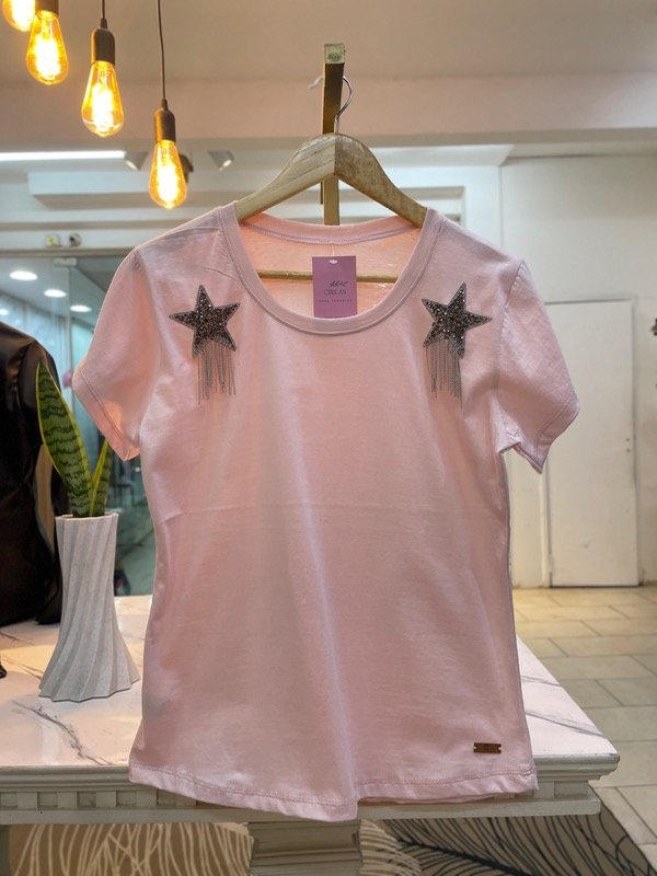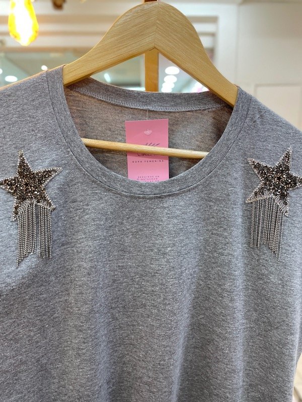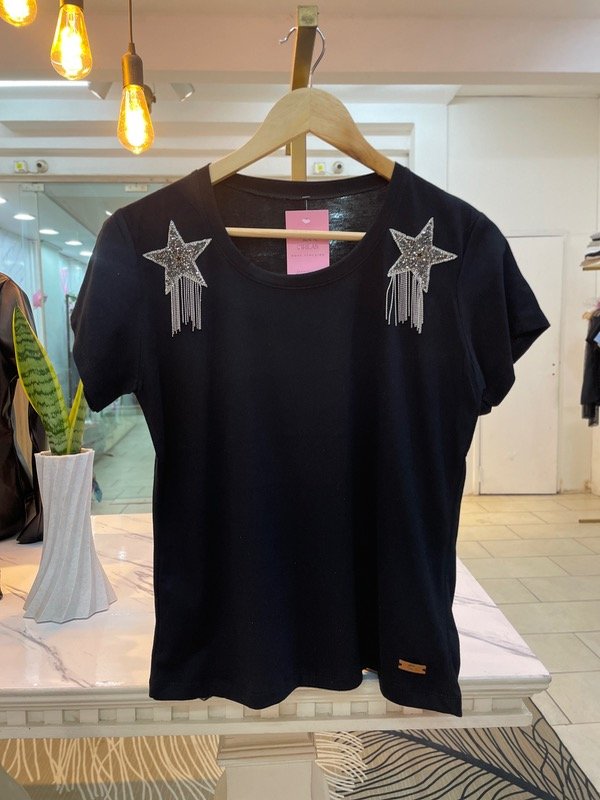 De diseño moderno y femenino, esta remera de algodón combina comodidad con detalles únicos: estrella bordada en strass en el frente y cadenas metálicas en los hombros. Perfecta para looks casuales con un toque glam.
