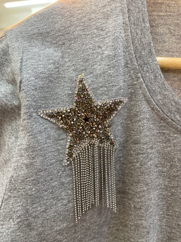 Remera de algodón con estrella de brillos y cadenas en hombros