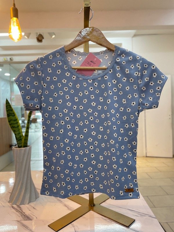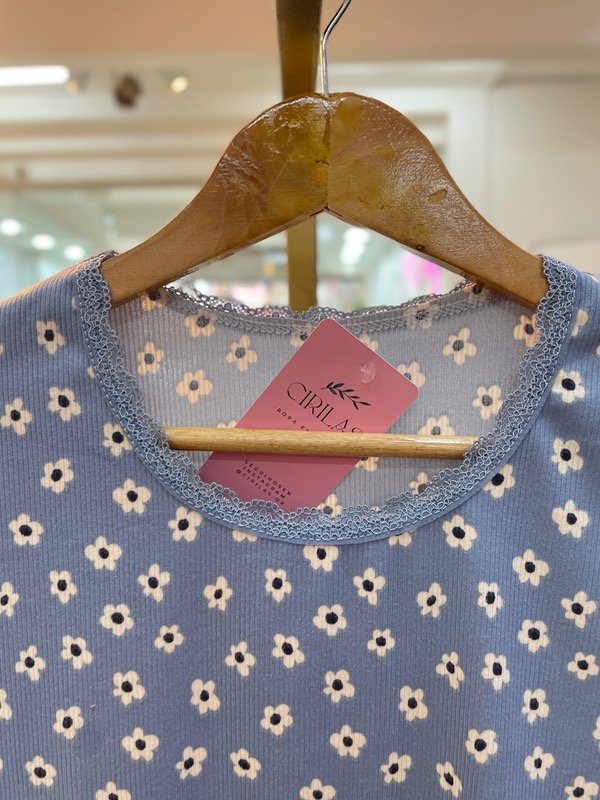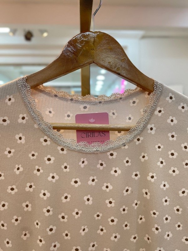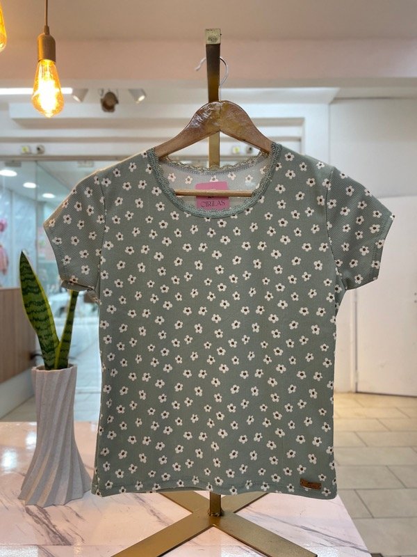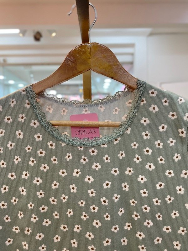 Dale un toque delicado y fresco a tu look con nuestra remera de morley, estampada con margaritas y detalle de puntilla en el cuello. Disponible en verde, celeste y beige, en talle único, combina estilo y comodidad para cualquier ocasión casual.