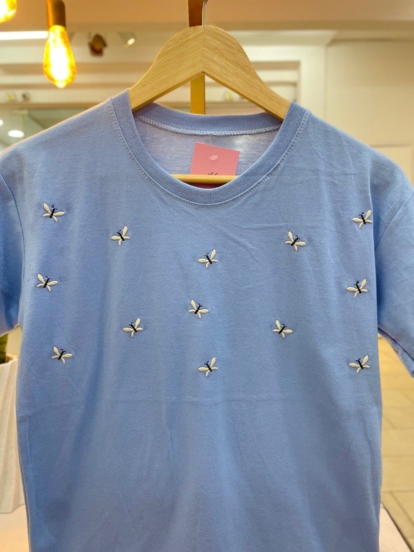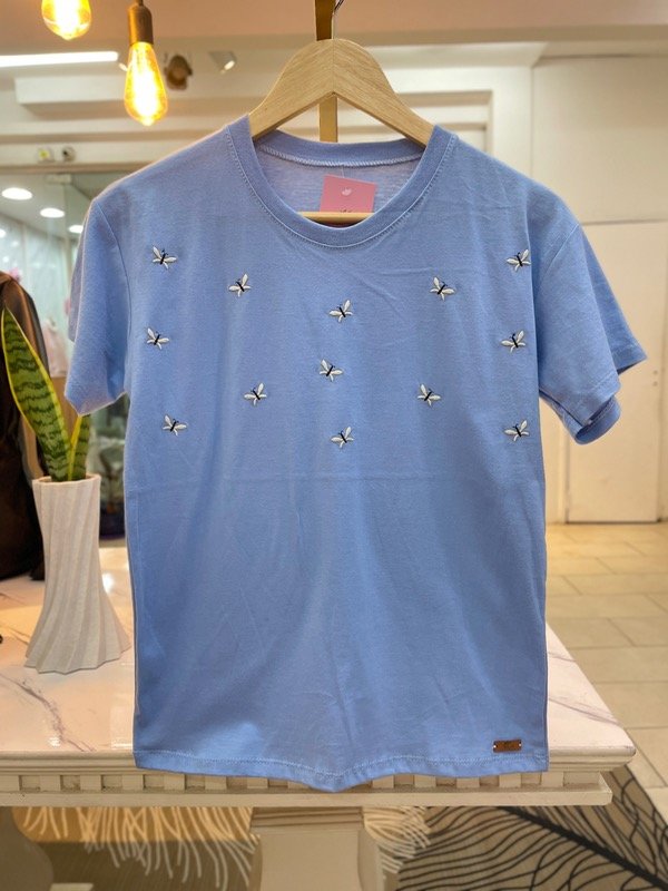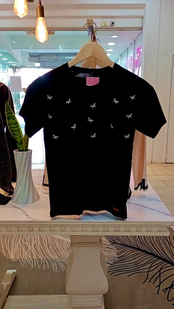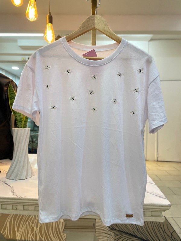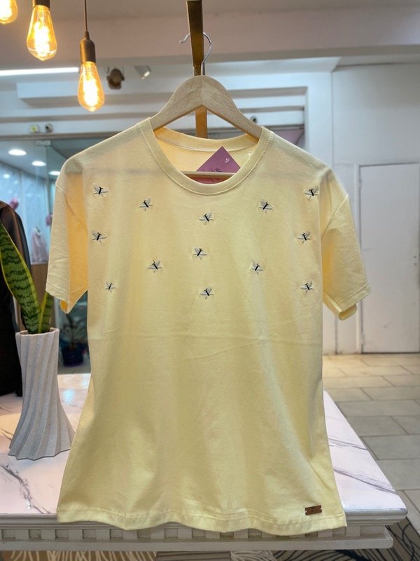Una prenda fresca, cómoda y femenina. Confeccionada en algodón liviano, con bordado de maripositas en el frente, escote redondo y mangas cortas. Ideal para usar sola o debajo de un blazer o saquito.