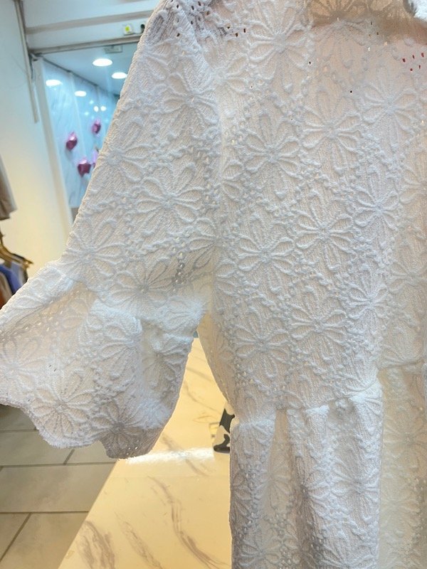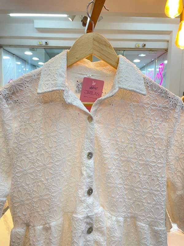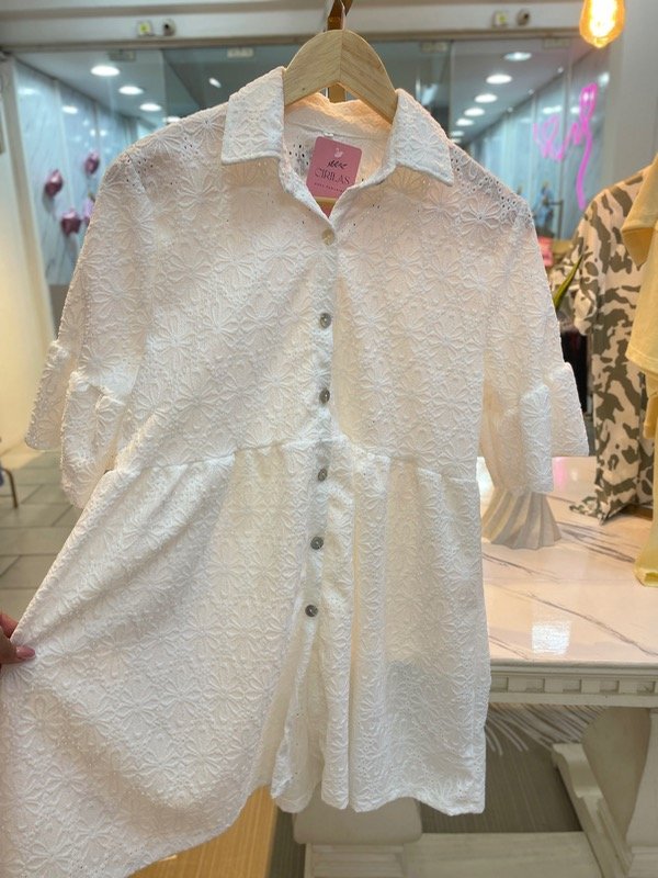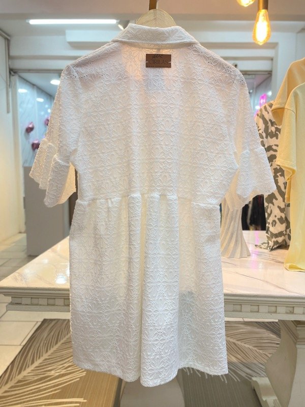 Luce radiante con este delicado vestido de broderi en blanco y beige. Su cuello tipo camisa y botones frontales le dan un toque clásico, mientras que las mangas con volados aportan frescura y movimiento a tu look. Ideal para eventos, salidas o días especiales, este vestido combina comodidad y estilo en un solo talle 2. ¡Un básico que no puede faltar en tu guardarropa! 🌸